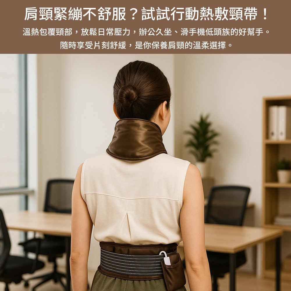 辦公桌長期久坐,3C重度使用族群,「黑陶石行動智能頸帶」讓您工作和休閒隨時移動熱熱敷。