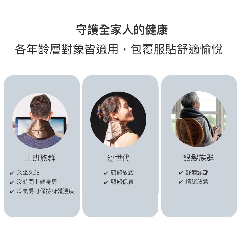 溫熱送暖,保護頸部,不分年齡族群,享受舒適「坐保健」。